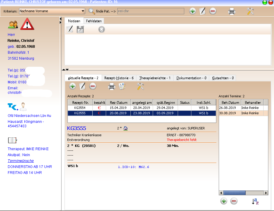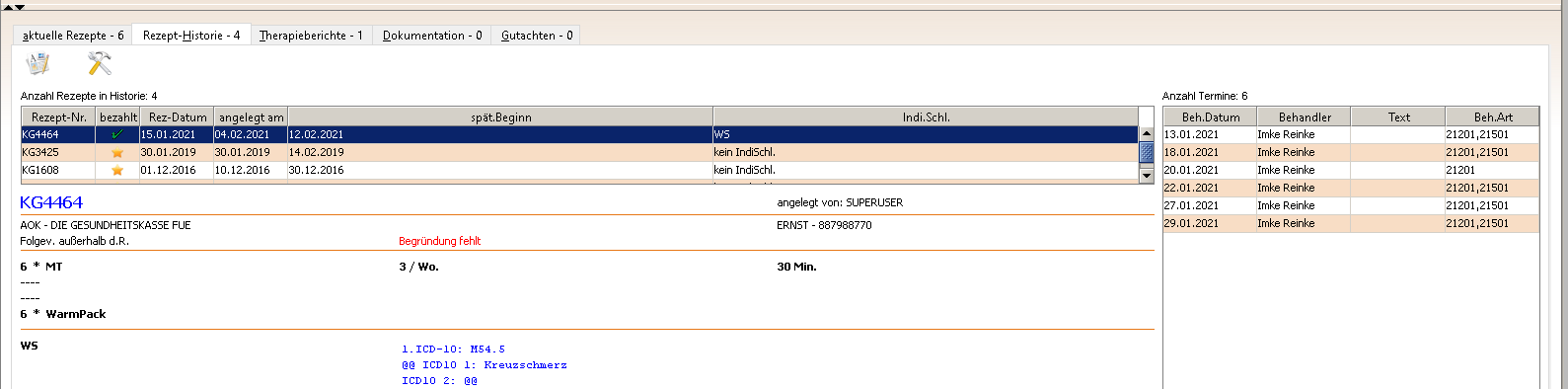 Die Erstverordnung wird händisch eingepflegt, Folgeverordnung als Kopie arbeitssparend angelegt. Der HMR-Check prüft verschiedene Faktoren, wie Ausstellungsdatum – 1. Behandlung, die Heilmittelkombination, in der Physiotherapie können Kindrezepte verwaltet werden.